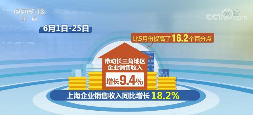 从重点区域看,前期受疫情影响较大的上海正在加快恢复,区域带动作用逐渐显现。6月1日—25日,上海企业销售收入同比增长18.2%,带动长三角地区的企业销售收入增长9.4%,比5月份提高了16.2个百分点。